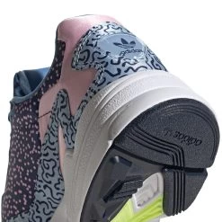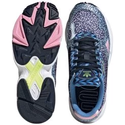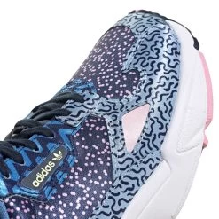 Der Falcon Sneaker reiste förmlich durch die Vergangenheit und lies sich von den prägnanten Styles der Jahrzehnte inspirieren. Demzufolge erinnert die breite Schuhform an die 90er Jahre, während das Obermaterial noch etwas ferner zurück liegt und an die einprägsamen Muster aus den 80er Jahren anknüpft. Das glänzende Satin in einem rosa-blau Ensemble stimmt auf den femininen Style ein, welchen die adidas Originals „Out Loud“-Kollektion verkörpern möchte. Demnach sollst du heiter durchs Leben gehen und freudestrahlend singen „Weil ich ein Mädchen bin…“.